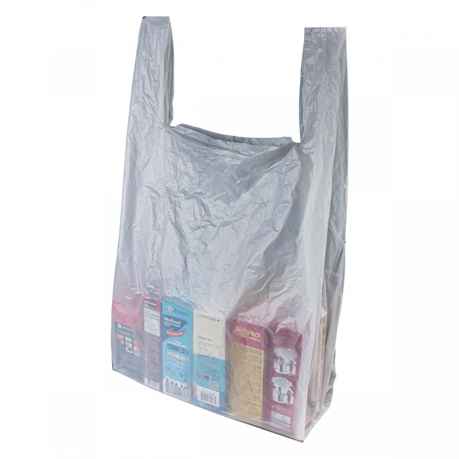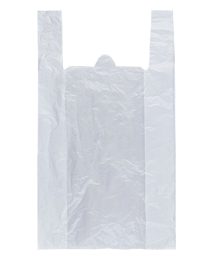 Пакеты-майка белого цвета, размер 42x75 см, толщина 20 мкм. Есть боковые фальцы. Используются в магазинах и супермакетах для упаковки различных товаров (одежды, обуви, техники, канцелярии и др.).