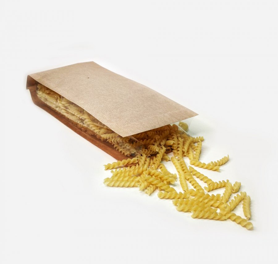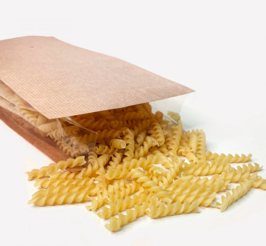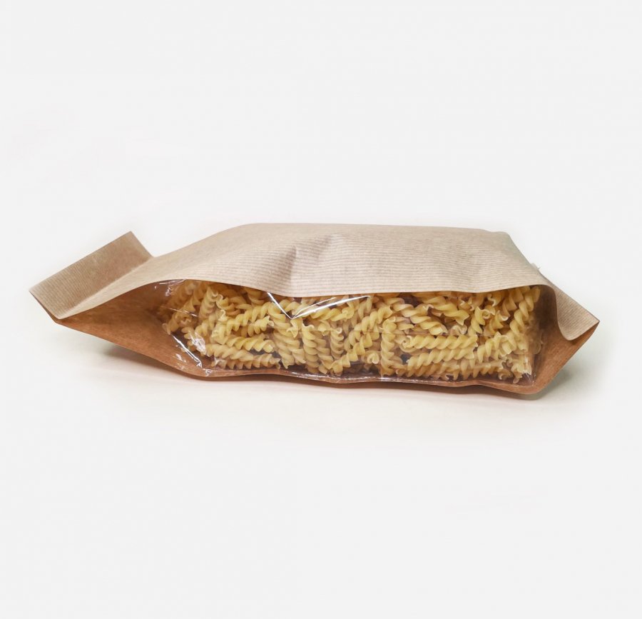 - Пакеты из бурого крафта с прозрачными фальцами. Размер 13x31 см, ширина боковых фальцев 7 см. Внутри ламинация.