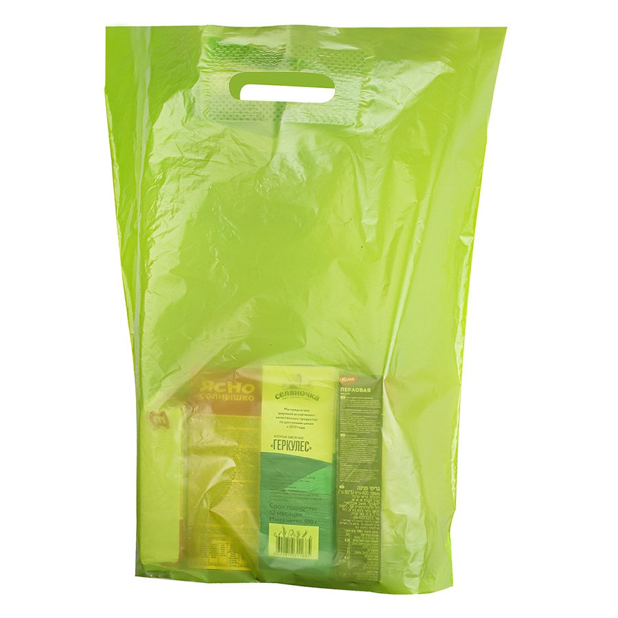 - Салатовые пакеты ПВД с вырубной ручкой, размер 40x50 см (толщина 50 микрон) с донной складкой.