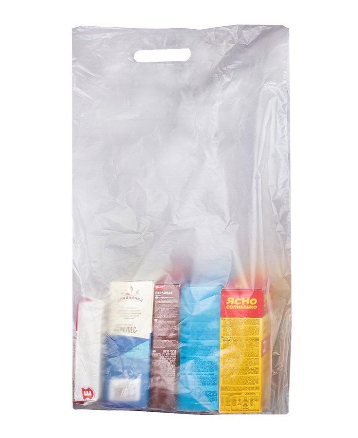 - Прозрачные пакеты ПНД с неукрепленной вырубной ручкой, размер 45x65 см (толщина 35 микрон) с донной складкой.