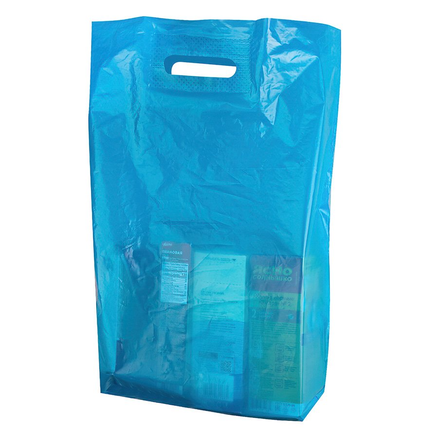 - Голубые пакеты ПВД с вырубной ручкой, размер 40x50 см (толщина 50 микрон) с донной складкой.