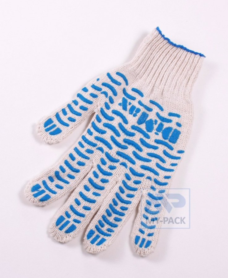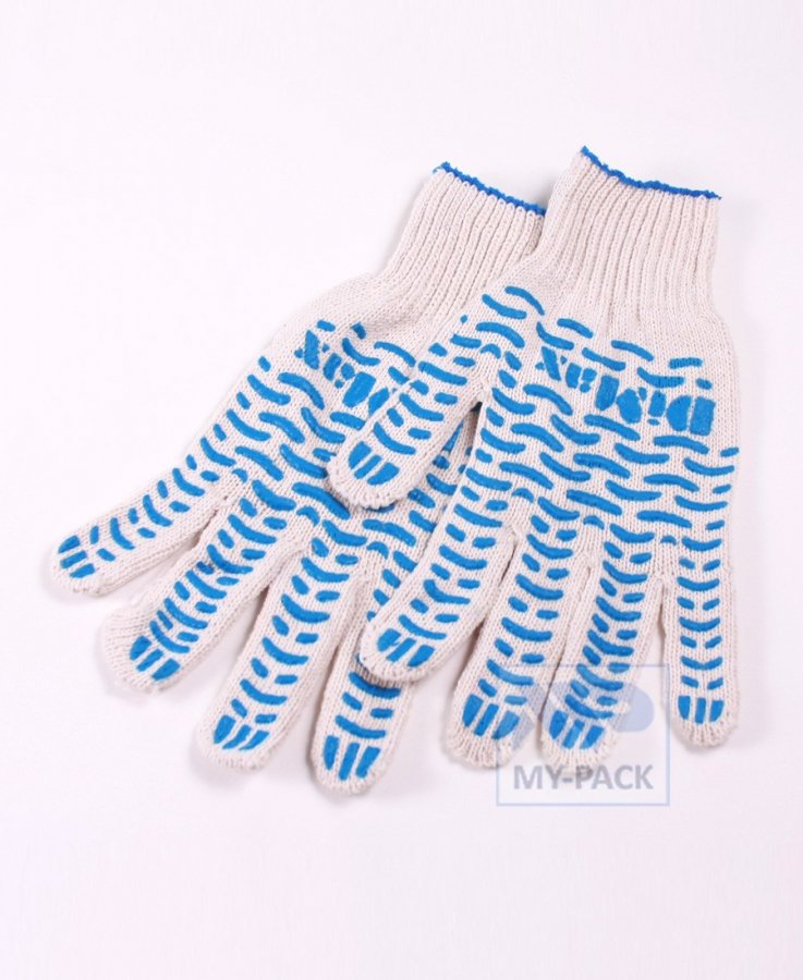 Перчатки ХБ с ПВХ "Волна" 4 нити, 7,5 класс, знак "+" означает улучшенное качество – эти перчатки выполнены из натурального материала с напылением из пвх, выполненного «горячим» способом. Вязка в четыре нити обеспечивает их прочность и долговечность, а рисунок из эластичного пластика синего цвета усиливают защитные свойства перчатки в несколько раз. Высокий манжет, вязанный резинкой, позволяет перчатке уверенно сидеть на руке и не сползать во время работы. Такие перчатки незаменимы в быту, при работе на открытом воздухе, в частности на даче. При манипуляциях с предметами, имеющими неровную поверхность или края, при любом риске травм для рук. С перчатками хб с пвх вы забудете, что такое мозоли, порезы, занозы и даже ушибы. Так как ПВХ напыление смягчает силу удара в несколько раз.