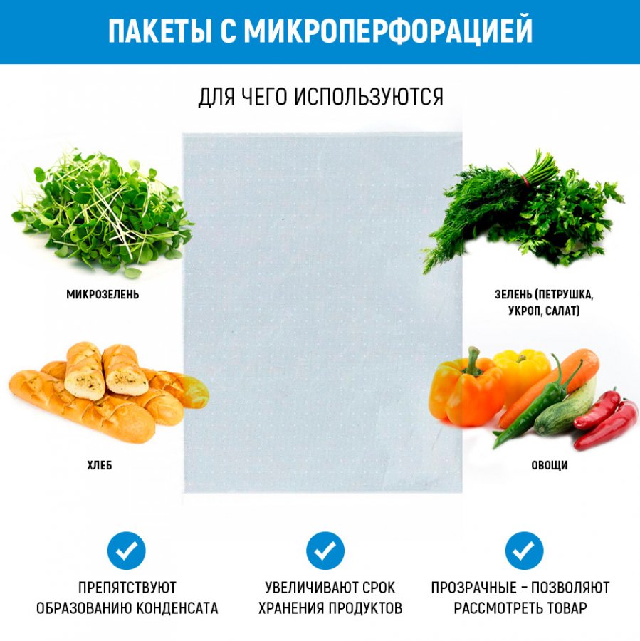 - Прозрачные полипропиленовые пакеты с микроперфорацией - размер 15x35 см, толщина 30 мкм - идеальная упаковка для скоропортящихся пищевых продуктов. Например, в них можно фасовать зелень, микрозелень, овощи, хлеб.
