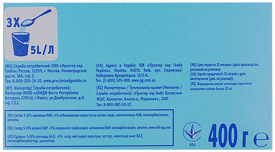 Состав: 5-15% анионные ПАВ; <5% отбеливающие вещества на основе хлора, неиногенные ПАВ, поликарбоксилаты, цеолиты.