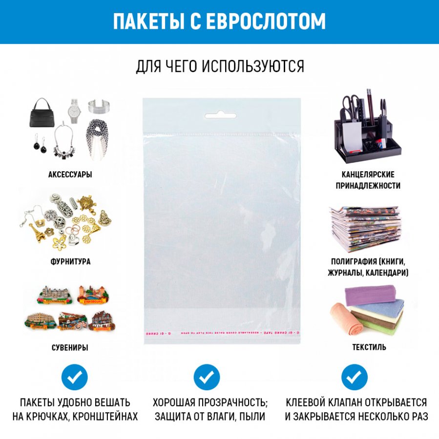 - Полипропиленовые пакеты 20x30 см, толщина 25 мкм с белым еврослотом и клеевым клапаном применяются для упаковки аксессуаров, бижутерии, фурнитуры, сувениров, канцелярских принадлежностей и других товаров.