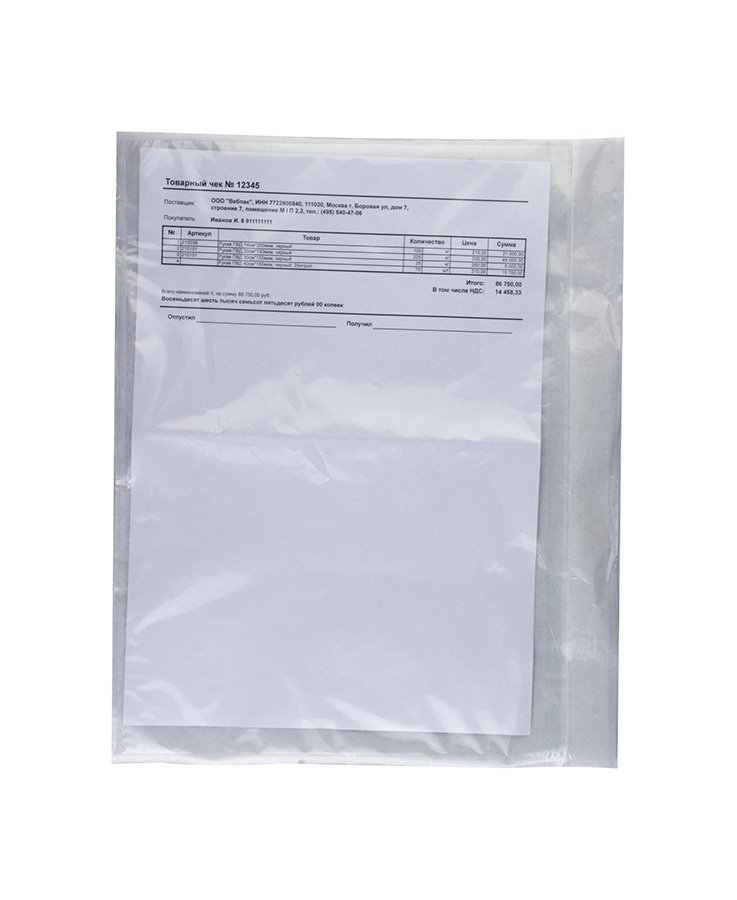 Самоклеящийся прозрачный пакет карман для сопроводительных документов, клеевой слой на обороте и на клапане (отрывная лента). Это специальный конверт из плотного полиэтилена, который приклеивается на различные грузы, картонные коробки, курьерские пакеты и содержит сопроводительные документы. Предназначен для упаковки вложений формата А4. Цвет белый. Одна из сторон - прозрачная.