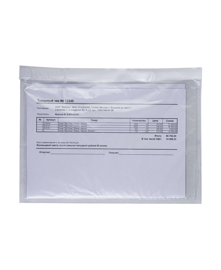 Используются при отправке грузов, посылок, бандеролей: накладные, таможенные документы, квитанции, адресные бланки - любой из этих документов можно вложить в самоклеящийся сопроводительный пакет, запечатать и приклеить его к посылке. Благодаря самоклеящемуся пакету документы будут в сохранности, а вероятность замены груза снизится.